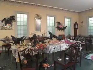 Critics described the "Altered States" exhibition as a faux-Colonial memento mori suggesting a mansion ravaged by fire and floods and reclaimed by the elements, which also pointed to deep fissures in American culture.[39][40][36] Its individual works included: the sandy, emaciated Shipwrecked Armoire with Barnacles; Headless George Washington with Table (Lansdowne Portrait), a horrific reimagining of the Stuart portrait, torn asunder and scorched, with its partially melted head sliding onto the gallery floor like a shriveled mask; and Rug with Grass, a shredded, rotted Empire style carpet sprouting reeds and aquatic plants that indicated the potential of growth out of decay.[36][40][39][7] Hegarty's exhibition "Alternative Histories," (Brooklyn Museum, 2013) explored similar themes—colonization, Manifest Destiny, repressed history, mortality—with sculptural interventions in the museum's decorated, period rooms that included a flock of attacking crows, dissolving portraits, vanitas-influenced still lifes and rugs overgrown with vegetation.[41][12][42]