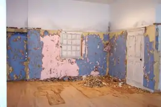 Hegarty's early work explored architecture, artifice, ephemerality and memory, often by resurrecting physical environments of the past through a process of layering illusionistic imagery on paper and then peeling it to expose strata—as in an archeological diagram—evoking senses of nostalgia, displacement, mortality, or emergent repressed forces.[33][14][1] Two works created in Chicago—Hotel Lobby, West Loop (Gallery 400, 2002) and Green Bathroom (MCA Chicago, 2003)—partially transformed gallery spaces, respectively, into an aging downtown hotel and a recreation of her studio bathroom in a future state of neglect.[33][13] For "Play Pen" (Drawing Center, 2004), she created a to-scale rendition of the perimeter of her childhood bedroom that over the course of the exhibition she peeled away, revealing layers of yellow, periwinkle blue and bubblegum pink representing iterations of the room’s décor.[25][1]