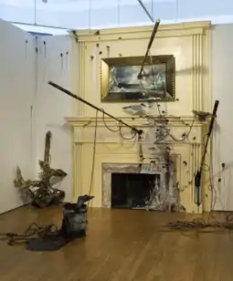 In her solo exhibitions "Seascape" (2006), "View From Thanatopsis" (2007) and "Altered States" (2012), Hegarty took over gallery spaces "in kudzu-like fashion,"[5] with simulations of shipwrecked and decimated paintings and Colonial furniture, sculptural debris and rot, and plants emerging from fissures in walls and floors.[2][38][39] "Seascape's" centerpiece was Overseas (Fireplace with Harpoons), a recreated Federalist-era fireplace, stuck full of harpoons and spattered with simulated tar, slime, mold, and seagull droppings that emanated from a harpoon wound in a reworking of the Church landscape The Icebergs (1861) hung over the mantel.[2] Artforum's Emily Hall wrote that the show portrayed the ocean as an "enormous engine of decay"—a retort to "artists who have sought to frame nature as something over which man has prevailed with moral authority" and to over-estimations of the timelessness of America's colonial values.[2] "View From Thanatopsis" included walls peppered with bullet holes, an armoire eaten to bits, a painting of the Grand Canyon split by a crack tearing through wall and floor, and a burnt, battered and doubled-over replication of Church's 1857 painting, Niagara.[38]