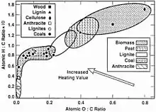 Van Krevelen diagrams are graphical plots developed by Dirk Willem van Krevelen (chemist and professor of fuel technology at the TU Delft) and used to assess the origin and maturity of kerogen and petroleum. The diagram cross-plots the hydrogen:carbon atomic ratio as a function of the oxygen:carbon atomic ratio.