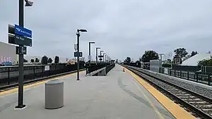 The station originally had a single side platform serving the southern track of the two-track Ventura Subdivision.[1] (A third track to the north is part of the Union Pacific Railroad Gemco Yard.[1][12] In January 2018, Metrolink began construction of an island platform — which serves both main tracks — and a pedestrian underpass.[13] Original plans called for a second side platform instead, but the island platform design had fewer impacts.[12] The project was originally to be completed in late 2019,[14] but was not officially finished until January 2020.[15]