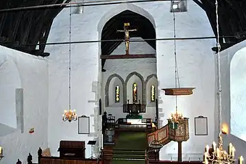 The church has a rectangular nave measuring about 18 by 13 metres (59 ft × 43 ft) and a smaller, narrower choir measuring about 10.4 by 9.6 metres (34 ft × 31 ft). It does not have a sacristy, porch, or tower. The stone walls of the church are all 6 metres (20 ft) high and are also about 1.3 to 1.6 metres (4 ft 3 in to 5 ft 3 in) thick. The ceiling of the church reaches 18 metres (59 ft) high at the highest point. The church has a hexagonal pulpit from the early 17th century. It is decorated with painted tulips, brass ornaments, and pilasters in green, yellow and red against a pale yellow background.[4][3][5]