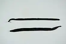 The seed is planted at the foot of a small tree and the vine scrambles up the trunk. When it gets too tall to be easily reached, it is detached from the trunk and wound round it, the trunk becoming surrounded by multiple layers of vine. The plant starts flowering when three years old, and as the flowers only last for a day, they need to be hand-pollinated in a timely manner. The pods develop over a period of about nine months, and they are picked by hand when they turn reddish-brown. They are then sun-dried by day and placed in sweatboxes by night. The curing and fermentation process lasts for about three months, during which time the pods lose much of their moisture and become supple and oily.[3]