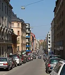 Compared to central Stockholm, streets were widened to 18 metres, except for the main east-west-bound street Odengatan which was made 30 metres wide and adorned with plantings after continental prototypes. In accordance with construction charters from the 1870s, building corners where filleted and building heights adopted to street width and limited to five floors — embellishing proportions intended to bring light and air into the urban space. The Neo-Renaissance plaster architecture of the middle class residential buildings in southern Vasastaden is highly reminiscent of the Ringstraße in Vienna; the ground floors are dominated by horizontal elements with columns and pilasters above, while accentuated cornices closes the vertical compositions. Later architects failed to appreciate these Neo-Renaissance buildings and freed many of them of most of their decorations.[1]