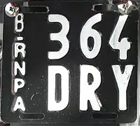 Motorcycle | 123/ABC | Until 2010. White on black; vertically at left is one-letter province code over a horizontal line over "RNPA". |