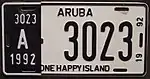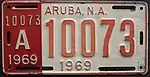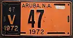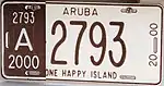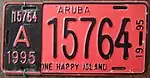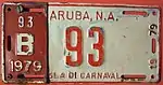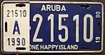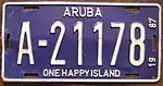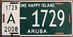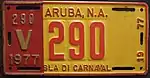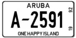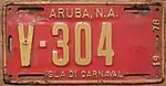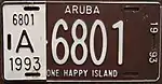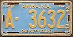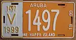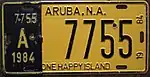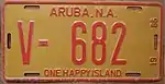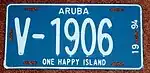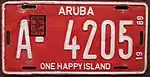 The license plates have been changed annually since 1950. Only until 1958 the name "ARUBA N.A." was displayed on it. In 1976 the slogan "ISLA DI CARNAVAL" (English :"Island of Carnaval") was added. The slogan was changed again in 1983 to display "ONE HAPPY ISLAND". When Aruba became its own autonomous country within the Kingdom of the Netherlands in 1986, the name "ARUBA N.A." was changed to "ARUBA". Since 2011 the word "ARUBA" was changed to "aruba.com".[1] The plate itself is valid for the first half of the year, and then a metal tab is added to indicate validity during the second half of the year.[2] This tab is painted in the reverse color scheme as the plate and displays the same serial number as the plate.[3]