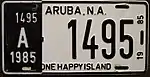 1986 red on yellow ONE HAPPY ISLAND A-12345 Last year for "Aruba N.A." at top of plate.