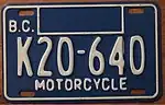 1974-78 | Orange on white plate, "B.C." in top left corner; "MOTORCYCLE" screened at bottom centre. | none | 123456 | ||
