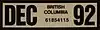 1924 | Embossed yellow serial on black plate with border line; "BRITISH COLUMBIA" at bottom and "24" at right | none | 12-345 | 1 to approximately 45-000 | First use of the full province name. |
