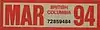 1930 | Embossed yellow serial on red plate with border line; "BRITISH COLUMBIA" at bottom and "30" at right | none | 123-456 | 1 to approximately 103-000 | |