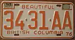 1976 | Orange on white | Beautiful British Columbia | 12-34-AB | 00-00-AA to approximately 25-00-DS | Letters I, O, Q, U and Z not used in serials; this practice continues today.[8] |