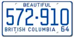1964 | Embossed blue serial on white plate with border line; "BRITISH COLUMBIA" centred at bottom; "64" at bottom right | "BEAUTIFUL" centred at top | 123-456 | 1 to approximately 573-000 | First use of the "Beautiful British Columbia" slogan. |