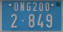 NGOs and international organisations can be issued plates signifying their organisational status. Plates are light blue with white text, with the designation ONG or OI in capital letters, representing the French spelling, Organisation Non Gouvernementale and Organisation Internationale.