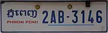 Cambodian car license plate (current style), from a bus registered in Phnom Penh - US Standard Size