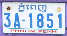 Cambodian vehicle license plates are the license plates attached to most motorized road vehicles in Cambodia, which are required by law. Cambodian license plates display the name of the province where the vehicle was registered. The owner must register the car in the province they live; this can be a different province from where the owner has his official residence (as shown in the housing register). If the title to the car is transferred to someone else, and the new owner lives in a different province, the number usually changes.