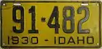 1930 Embossed black serial on golden yellow plate with border line; "1930 - IDAHO" at bottom none 123-456 1 to approximately 112-000