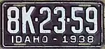 1938 Embossed white serial on maroon plate with border line; "IDAHO - 1938" at bottom none 1A-12-345 Coded by county of issuance (1A)