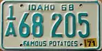 1968–70 Embossed green serial on white plate with border line; "IDAHO 68" centered at top "FAMOUS POTATOES" centered at bottom A 12345