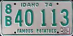 1974 Embossed green serial on white plate with border line; "IDAHO 74" centered at top "FAMOUS POTATOES" centered at bottom A 12345