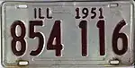 - ↑ "Illinois License Plates For 1951, Maroon on Silver". The Daily Register. Harrisburg, IL. September 29, 1950. p. 6.