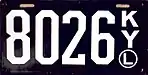 1910–11 White serial on black porcelain plate; vertical "KY" at right, above circle containing 'B' none 1234 1 to approximately 3200 Front and rear plates issued; this practice continued through 1943.