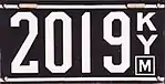 1912–13 White serial on black porcelain plate; white horizontal stripes at top and bottom; vertical "KY" at right, above square containing 'M' none 1234 1 to approximately 8000