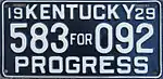 Rear: top of plate emblazoned with "19 KENTUCKY 29" with "FOR" in center of plate between serial numbers and "PROGRESS" emblazoned at bottom.