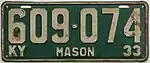 1933 Embossed white serial on green plate with border line; "KY", county name and "33" at bottom none 123-456 1 to 850-000
