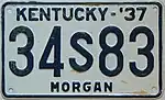1937 Embossed dark blue serial on white plate with border line; "KENTUCKY-'37" and county name centered at top and bottom respectively none 12345