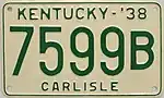 1938 Embossed green serial on white plate with border line; "KENTUCKY-'38" and county name centered at top and bottom respectively none 12345