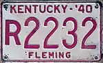 1940 Embossed red serial on white plate with border line; "KENTUCKY-'40" and county name centered at top and bottom respectively none 12345