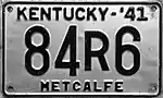 1941 Embossed black serial on silver plate with border line; "KENTUCKY-'41" and county name centered at top and bottom respectively none 12345