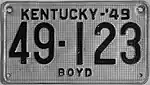 1946–47 Embossed silver serial on black plate with border line; "KENTUCKY-'46" and county name centered at top and bottom respectively none 123-456 Issued in blocks by county Revalidated for 1947 with windshield stickers.