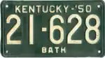 1950 Embossed white serial on waffle-textured green plate; "KENTUCKY-'50" and county name centered at top and bottom respectively none 123-456 Issued in blocks by county
