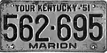 1951–52 Embossed black serial on silver plate; county name centered at bottom "TOUR KENTUCKY-'51" centered at top 123-456 Issued in blocks by county Revalidated for 1952 with windshield stickers, due to metal conservation for the Korean War.