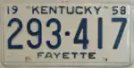 1958 Embossed dark blue serial on white plate; "19 KENTUCKY 58" at top; county name centered at bottom none 123-456