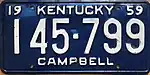 1959 Embossed white serial on dark blue plate; "19 KENTUCKY 59" at top; county name centered at bottom none 123-456