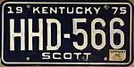 1975–77 Embossed white serial on dark blue plate with border line; "19 KENTUCKY 75" at top; county name centered at bottom none ABC-123 Issued in blocks by county Revalidated for 1976 and 1977 with stickers. Letters I, O, Q and U not used in serials; this practice continues today.[2]