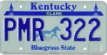 January 1998 – November 2002 Embossed blue serial on graphic plate with light blue sky, white state-shaped cloud and green rolling hills; "Kentucky" screened in black centered at top; county name on green sticker in debossed box centered at bottom "BLUEGRASS STATE" screened in black centered below state name 123 ABC 000 AAA to approximately 700 HYJ