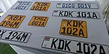 The current series of vehicle registration plates in Kenya are on a white plate with black lettering and look quite similar to UK suffix style registrations. The format is LLL NNNL, where ‘L’ denotes a letter and ‘N’ denotes a digit. The older series of number plates were black with white or silver lettering. Later in the older series the front plates were reflective white with black lettering and the rear plates were reflective yellow with black lettering. According to Kenya National Bureau of Statistics there are over 1,626,380 vehicles in Kenyan road as at 2011.[1]