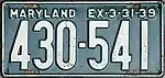 1938–39 Embossed white serial on green plate with border line; "MARYLAND EX-3-31-39" at top none 123-456 30-000 to approximately 508-000