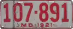 1921 Embossed red serial on white plate with border line; "MD·1921" centered at bottom none 123-456 30-000 to approximately 138-000