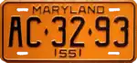1954–55 Embossed black serial on golden yellow plate with border line; "MARYLAND" and "55" centered at top and bottom respectively none AB♦12♦34 Letter K added to two-letter series.