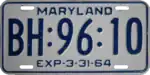 1963–64 Embossed blue serial on white plate with border line; "MARYLAND" and "EXP-3-31-64" centered at top and bottom respectively none AB:12:34 AA:10:01 to approximately FX:92:00