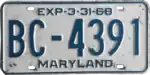 1967–68 Embossed blue serial on white plate with border line; "EXP-3-31-68" and "MARYLAND" centered at top and bottom respectively none AB-1234 AA-1001 to approximately HG-8000