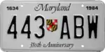 August 1983 – February 1986 Embossed black serial on reflective white plate; shield with design of the state flag screened in the center; "Maryland" screened in black centered at top; "1634" and "1984" screened on either side of state name "350th Anniversary" screened in black centered at bottom 123 ABC 001 AAA to approximately 999 AKE Commemorated the 350th anniversary of the settlement of Maryland. Awarded "Plate of the Year" for best new license plate of 1984 by the Automobile License Plate Collectors Association, the first time Maryland was so honored. Adopted as standard passenger base from 1986 to 2010 (see above).