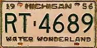 1956 Dark green on white; "19 MICHIGAN 56" at top Water Wonderland AB-1234 County-coded First 6" x 12" plate.