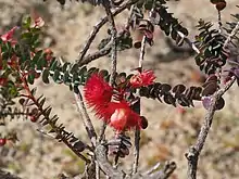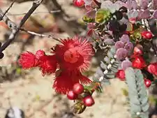 The flowers are arranged in spike-like groups on stalks 3–10 mm (0.1–0.4 in) long. The floral cup is top-shaped, 3–5 mm (0.1–0.2 in) long, glabrous and smooth with curved green appendages. The sepals are bright red, often creamish-green on their lower parts, 7–10 mm (0.3–0.4 in) long, with 8 to 16 feathery lobes. The petals are cream-coloured to pink when they open but become bright red, 6–10 mm (0.2–0.4 in) long, with a feathery edge and 2 ear-shaped appendages at their base. The style is 12–20 mm (0.5–0.8 in) long, gently curved, with simple hairs and extends well beyond the petals. Flowering time is from July to November or December.[2]