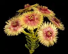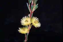 The flowers are scented and arranged in rounded, corymb-like groups near the ends of the branches, each flower on a stalk 10–25 mm (0.4–1 in) long. The floral cup is about 2.5–3.5 mm (0.098–0.14 in) long, glabrous and slightly warty in the lower half. The sepals are lemon-yellow, bright yellow or golden-yellow but quickly age to pinkish-red, reddish-brown or reddish-grey, spreading, 5–6.5 mm (0.20–0.26 in) long, with 10 to 13 densely hairy lobes. The petals are the same colour as the sepals, spreading 4.5–6 mm (0.18–0.24 in), with long, pointed finger-like projections. The tips of the stamens have two horn-like appendages. The style is straight, about 1 mm (0.04 in) long, and glabrous. Flowering time is from August to December.[2]