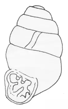 Aperture is semioval, contracted or sinuous in the middle of the outer edge; teeth six or seven, viz. two on the pillar [parietal wall], two on the pillar lip (the inner one of which is always larger, and the outside one tubercular and placed in the angle where the outer lip joins), and two or three within the outer lip (the third, when it is present, placed near the pillar lip and being a mere tubercle:) outer lip rather thick and slightly reflected, strengthened by a strong rib both outside and inside, which is situate near the opening of the mouth and is yellowish-white; outer edge rather abruptly inflected; inner lip slightly thickened in full grown specimens; umbilicus small and narrow, contracted by a rather sharp and gibbous crest or ridge at the base of the shell.[4]